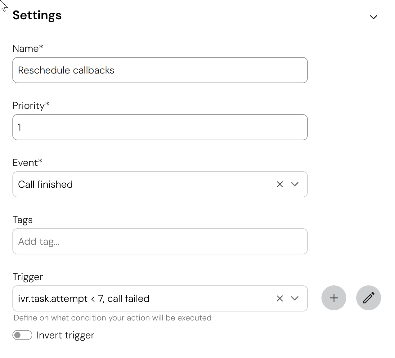 For the rescheduling of the task, the correct trigger is needed. You decide, how often you want to try to connect the call to an agent, usually 5 - 7 attempts is reasonable. You can adjust this any time. Here is how to setup your trigger: