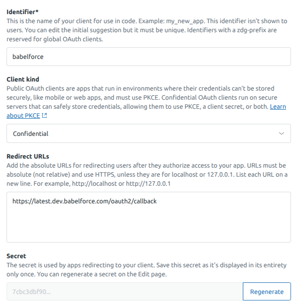 - The redircet URL should look like this: https://{{env}}.babelforce.com/oauth2/callback