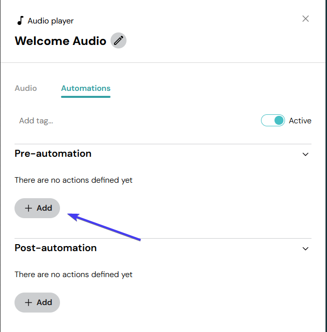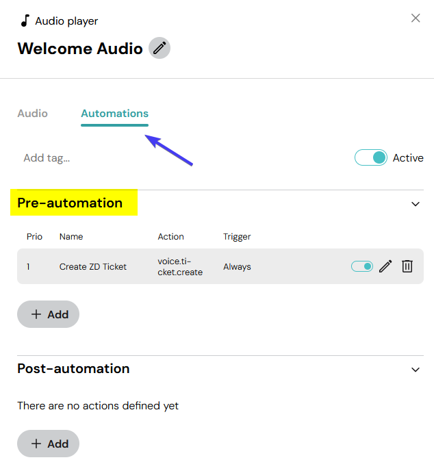 Double click on the Welcome Audio and find the tab "Automations". Whenever a Local Automation is connected to the call module, you will find it under this tab. In the example below, the "Action" of the Automation is called voice ticket create.