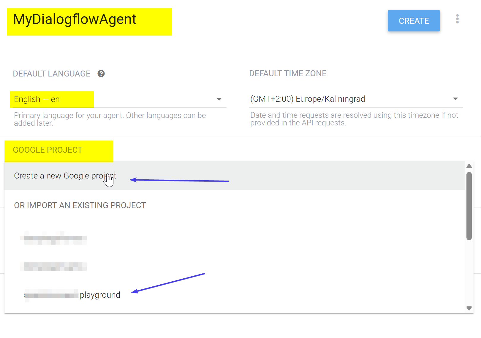 - Start by creating a new agent here: Dialogflow console