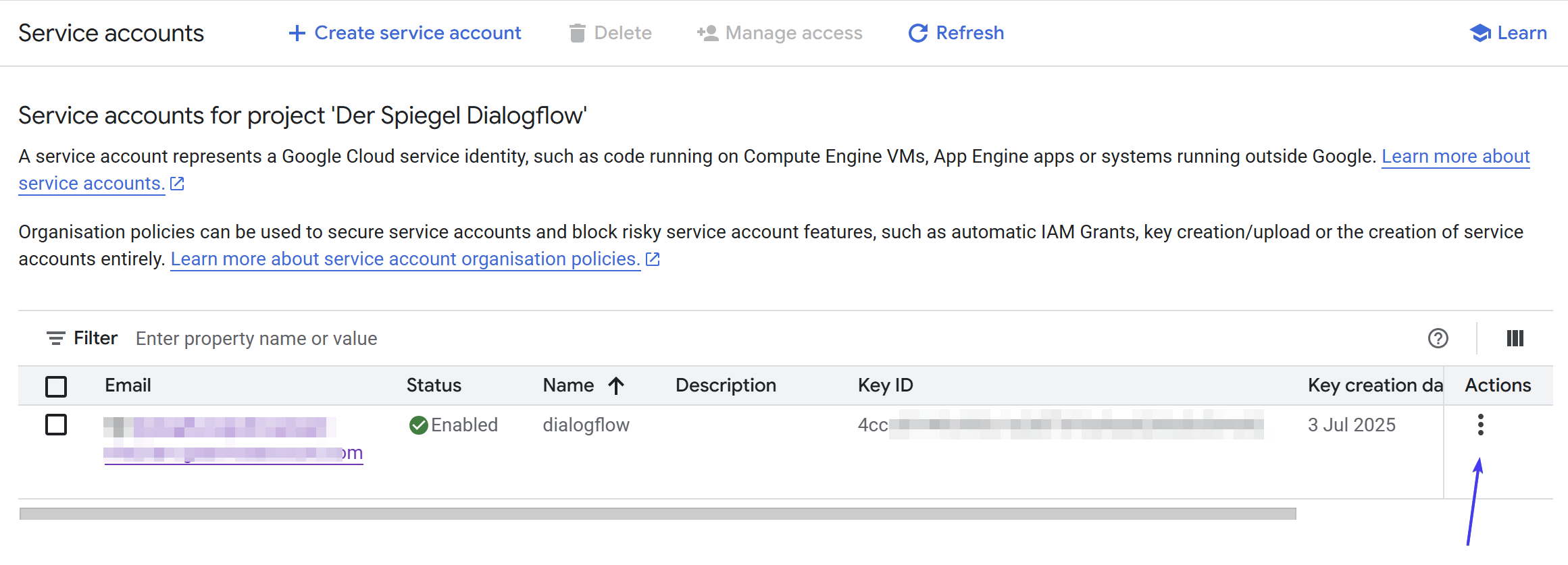 - Once it's created, find the service account, click "Actions" and select "Manage Keys"