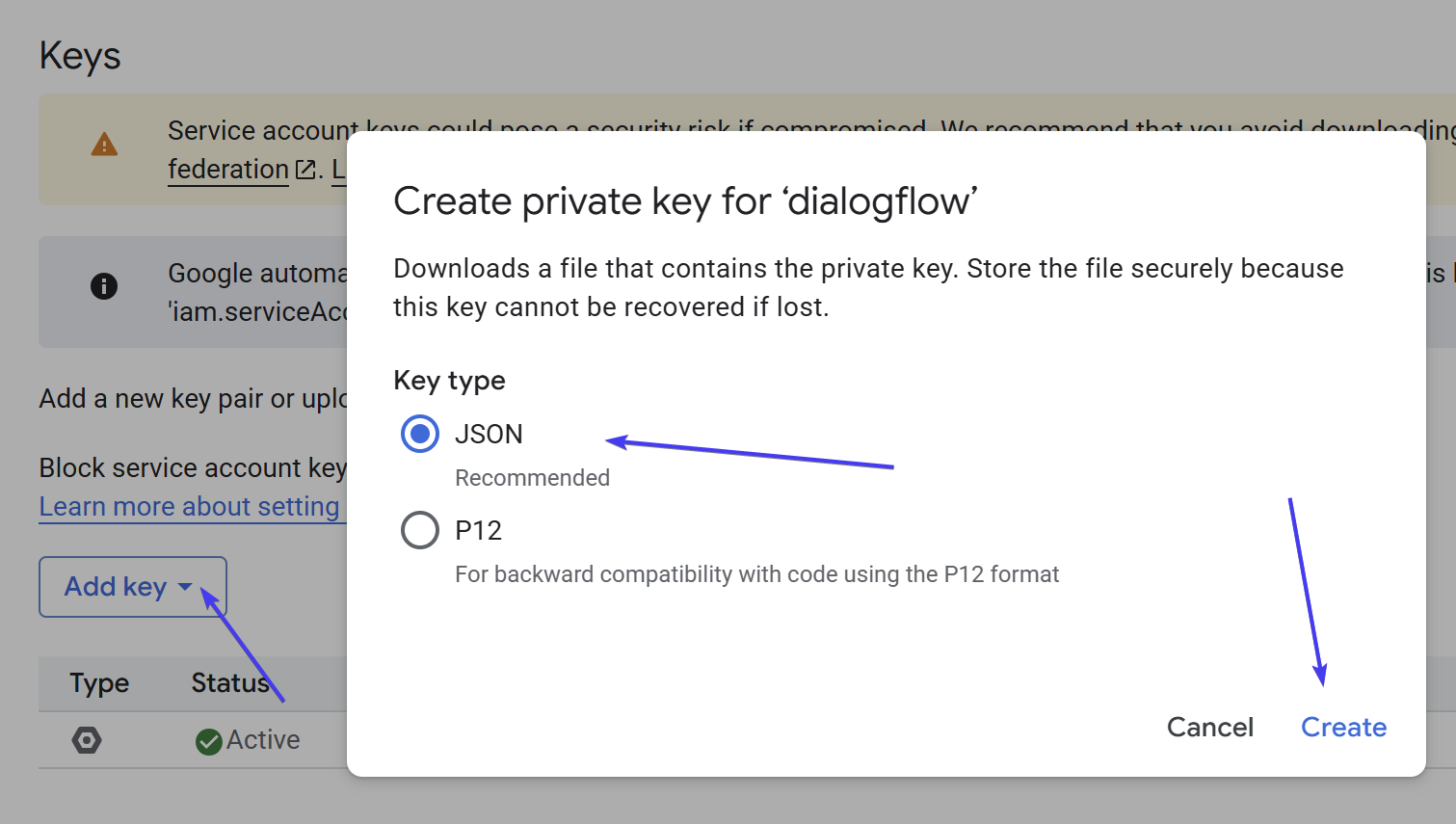 - Select Key type JSON and click on "Create"