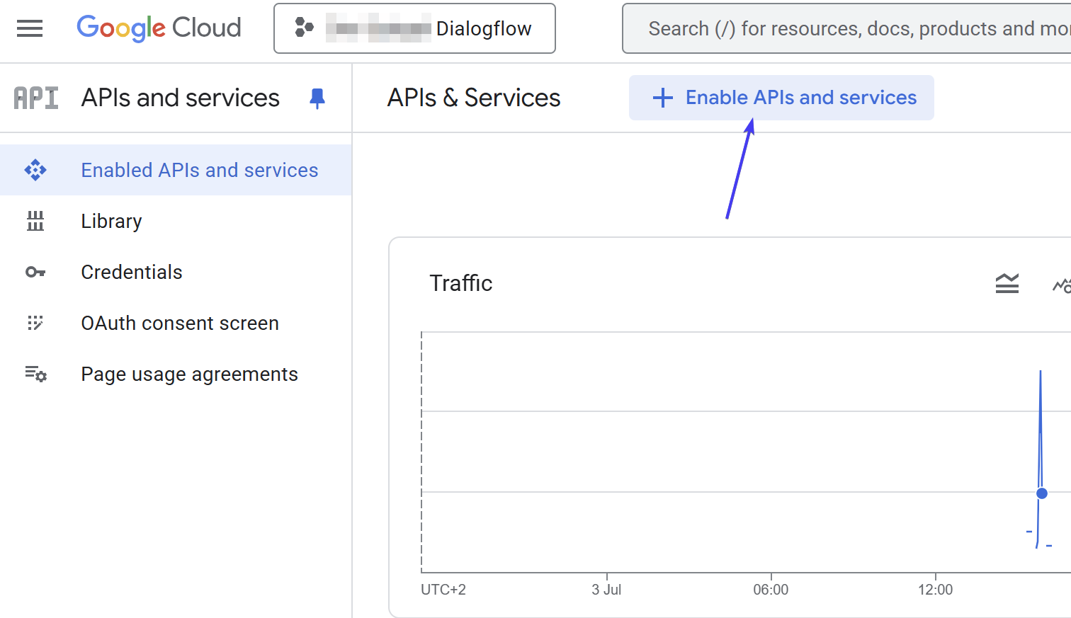 - .Once you are in the right project, click on "Enable APIs and services" and search for "Dialogflow"